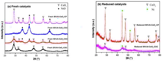 The X-ray diffraction patterns of the fresh Ni-CeO2 are shown in Figure 2a. The fresh 20% Ni-CeO2-CSC exhibits the characteristic diffraction peaks of CeO2, and no peaks of NiO are observed. The broad diffraction peaks and low intensity could indicate small crystallites or solids with low crystallinity, such as amorphous phase. From the following HRTEM image, we found small crystallites, and no amorphous phase was observed. Therefore, the broad diffraction peaks and low intensity are due to the small crystallites. The XRD result indicates that NiO is highly dispersed in the 20% Ni-CeO2-CSC catalyst. When the Ni loading increased to 50%, the weak and broad diffraction peaks of CeO2 and NiO were observed, indicating that NiO and CeO2 particle sizes are small in the catalyst. The 80% Ni-CeO2-CSC catalyst exhibits an obvious NiO diffraction peak, and no peaks of CeO2 are observed in the catalyst. The 50% Ni-CeO2-CP catalyst shows sharp diffraction peaks of NiO and CeO2, indicating that the 50% Ni-CeO2-CP catalyst has large NiO and CeO2 crystal particles.
