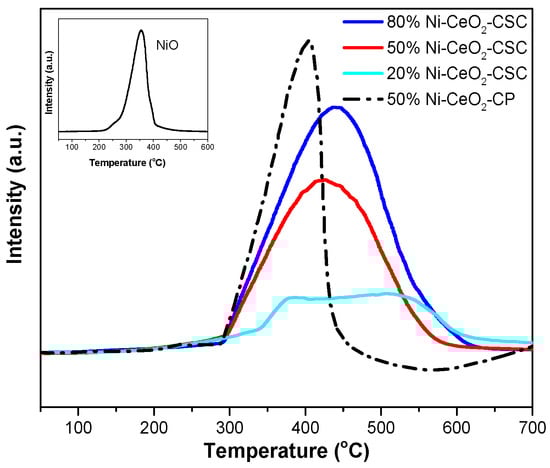 Figure 4 shows the H2 programmed temperature reduction (H2-TPR) profiles of the NiO and Ni-CeO2 catalysts. NiO was prepared by calcining nickel nitrate hexahydrate at 450 °C for 4 h. For pure NiO, only one hydrogen consumption peak located at 355 °C was observed. Combined with the XRD characterization results, the reduction peak at 403 °C of the 50% Ni-CeO2-CP can be assigned to the reduction in the large NiO particles that interacted weakly with CeO2 [32]. However, the Ni-CeO2-CSC catalysts exhibit a broad peak between 300 and 600 °C, which is attributed to the reduction in the surface CeO2 and the small NiO particles that interacted with CeO2 [36].