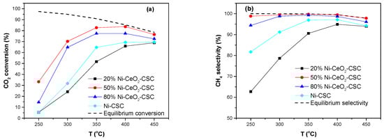 Figure 5 shows the catalytic performance of the Ni-CeO2-CSC catalysts. At low temperatures, the CO2 conversion and CH4 selectivity of the 20% Ni-CeO2-CSC catalyst were low. This could be due to most of the Ni surface being covered by CeO2 in the 20% Ni-CeO2-CSC catalyst. When the nickel content increased from 20% to 50%, the CO2 conversion and CH4 selectivity of the Ni-CeO2-CSC increased significantly. When the nickel content further increased to 80%, the conversion and selectivity of the catalyst decreased. The Ni-CSC catalyst with 100% Ni content showed low CO2 conversion and CH4 selectivity, especially at low temperatures. The 50% Ni-CeO2-CSC catalyst had the best catalytic performance among the Ni-CeO2-CSC catalysts. At temperatures higher than 400 °C, the conversion and selectivity of the catalyst decreased slightly, due to the limitation of the thermodynamic equilibrium of CO2 methanation and the formation of CO in the reverse water–gas shift reaction [38,39].