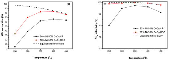 The comparison of the catalytic activities of the 50% Ni-CeO2-CP and 50% Ni-CeO2-CSC catalysts is shown in Figure 6. Compared with the 50% Ni-CeO2-CP, 50% Ni-CeO2-CSC had a higher CO2 conversion and CH4 selectivity in the temperature range of 250 to 450 °C. At 250 °C, the CO2 conversions of the 50% Ni-CeO2-CSC and the 50% Ni-CeO2-CP were 33% and 4%, respectively. The former is about eight times the latter, indicating that the 50% Ni-CeO2-CSC catalyst has better low-temperature activity.