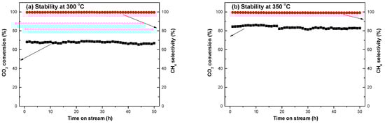 The stability test of the 50% Ni-CeO2-CSC catalyst was conducted at 300 and 350 °C, and the results are shown in Figure 7. The catalytic performance was stable for 50 h, and the CO2 conversions at 300 and 350 °C remained around 68% and 82%, respectively. The CH4 selectivity was higher than 99%. The results show that the 50% Ni-CeO2-CSC catalyst has good stability. The embedded structure of the 50% Ni-CeO2-CSC catalyst can prevent the sintering or aggregation of the highly dispersed Ni during the methanation reaction, thus improving the stability of the catalyst. The excellent stability of the catalyst could be due to the pore wall embedded structure of the catalyst.