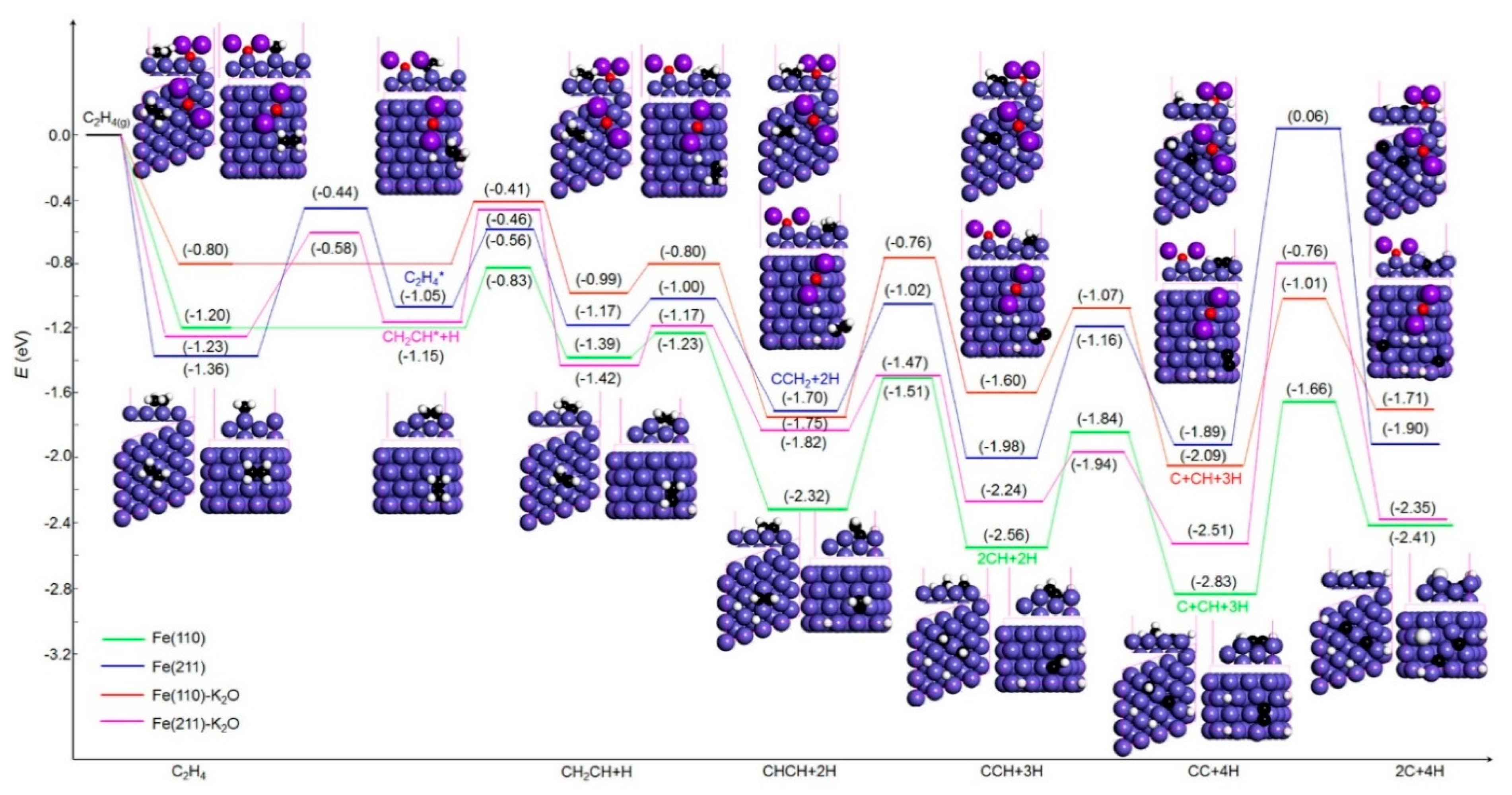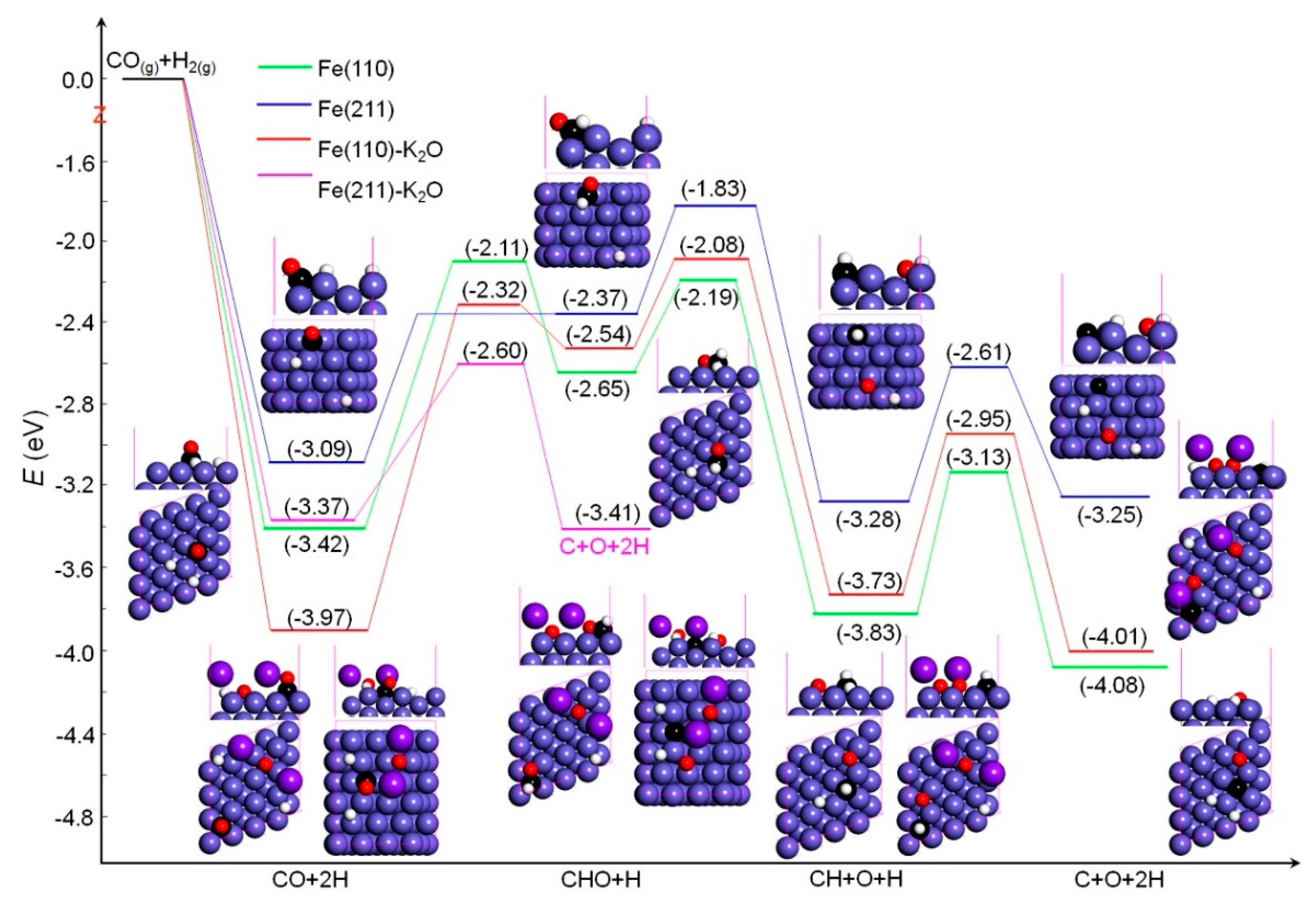 Gong, J.; Cao, C.; Sun, R.; Cui, L.; Gao, R.; Hao, H. A DFT Insight into the Tuning Effect of Potassium Promoter on the Formation of Carbon Atoms via Carburization Gases Dissociation on Iron-Based Catalysts. Catalysts 2020, 10, 527. https://doi.org/10.3390/catal10050527