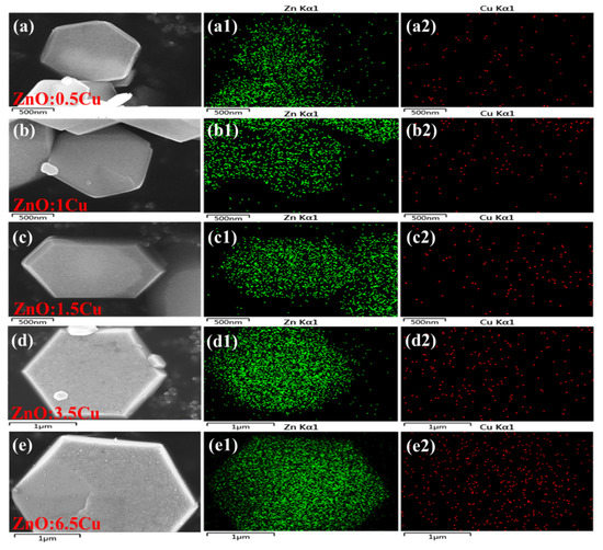 SEM images and corresponding elemental mapping of the reduced catalysts: ZnO:0.5Cu (a–a2), ZnO:1Cu (b–b2), ZnO:1.5Cu (c–c2), ZnO:3.5Cu (d–d2) and ZnO:6.5Cu (e–e2).