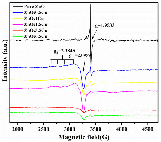 EPR is sensitive to the paramagnetic defects and the coordination of doped Cu2+ ions in ZnO. Figure 2 displayed the EPR profiles of the as-synthesized pristine plate ZnO and Cu doped plate ZnO. For all catalysts, the resonance at g = 1.953 is attributed to the shallow donor centers caused by the interstitial Zn (Zni) and surface O vacancy (Vo) [32,33,34]. Compared with the pristine plate ZnO, this peak intensity of plate ZnO:Cu samples was relatively weaker and decreased with the increasing of Cu doping amount. This phenomenon implies the incorporation of Cu into ZnO metal framework and the substitution of Zni [35]. Meanwhile, the anisotropic hyperfine structure was observed in Cu containing plate ZnO samples. The resonances parameter g// = 2.384 and g⊥ = 2.095 indicate that the Cu2+ replaces the cation sites of ZnO [36,37,38,39,40]. Furthermore, g// > g⊥ > ge = 2.002 unveils that Cu2+ ions are subjected to tetragonally elongated distortion and in a ligand field of tetragonal symmetry, coordinated by six ligand atoms [32,41]. However, when the amount of Cu reached 3.5 wt %, the anisotropic hyperfine structure was not obvious enough or even disappeared, which is attributed to the increase of the long-range dipolar interaction between Cu2+ ions along the increase of the Cu doping amount [37,42,43]. Thus, the EPR results confirm that Cu2+ was successfully doped into the ZnO lattice.