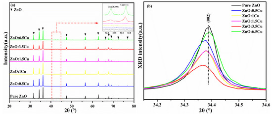 The XRD patterns of the calcined pristine ZnO and ZnO:XCu samples were presented in Figure 3a. The diffraction peaks located at 2θ = 31.74, 34.38, 36.21, 47.48, 56.53, 62.78, 66.30, 67.87, 69.00, 72.46 and 76.87° are corresponded to the diffraction from (100), (002), (101), (102), (110), (103), (200), (112), (201), (004) and (202) planes of the hexagonal wurtzite structure (JCPDS Card No. 89-1397), respectively. The diffraction pattern of all samples showed the orientation prefers along (101) plane and the hexagonal wurtzite structure was kept during doping. However, when the amount of Cu achieved 3.5 wt %, another two diffraction peaks appeared at approximately 2θ = 42.3 and 43.3°, attributed to the diffraction of Cu2O (200) and Cu (111), respectively. The appearance of Cu2O and elemental Cu may be due to the auto-reduction of the Cu2+ ions adsorbed on the surface of plate ZnO during the calcination in oxygen-free environment [44]. Figure 3b displayed the enlarged diffraction peak of Cu doped ZnO (002) plane, which clearly showed a left shift and an intensity decrease of this peak with a rise in Cu concentration. Such kinds of XRD diffraction peak shift and intensity decrease depend upon the preparation conditions like doping procedures and have been studied extensively in Cu doped ZnO [30,45]. However, ZnO:6.5Cu sample showed intensity increase and right shift of the (002) diffraction peak. Such a shift at higher Cu concentration is consistent with previous reported results on Cu doped ZnO film, but the reasons are not clear [46]. The XRD patterns of the reduced ZnO:XCu samples were shown in Figure S2. After reduction, Cu (111) phase can be observed over ZnO:3.5Cu and ZnO:6.5Cu samples except ZnO diffraction. Both EPR and XRD results demonstrate the doping of Cu into bulk plate ZnO; the direct contact Cu-ZnO interface will be produced after reduction in H2.
