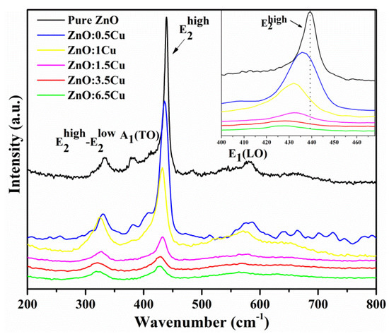 Raman spectroscopy is an effective technique to investigate structure changes induced by defects. The Raman spectra of the calcined plate ZnO and ZnO:XCu in the wave number range of 200–800 cm−1 were shown in Figure 4. The Raman peaks of pristine plate ZnO located at 332, 380, 438 and 582 cm−1 corresponded to -, A1(TO), and E1(LO), respectively. - and A1(TO) are attributed to a second-order phonon and first-order phonon, respectively. The Raman mode of is assigned to the oxygen vibration. The E1(LO) mode originates from second-order Raman scattering, which is affected by impurities and/or defects (Zni, Vo) [47]. It can be clearly seen from the inset of Figure 4 that the mode in ZnO:XCu exhibited red shift from 439 to 428 cm−1 compared with that of pristine ZnO. Furthermore, the showed a significant intensity decrease and line shape broadness along with the increase of Cu doping. The red shift, weakening and broadening of are the consequence of the defect formation and local lattice distortions caused by Cu doping [31,48]. Similar characteristics can be found in the previous publications [47,48]. This indicates the incorporation of Cu into ZnO, in good agreement with EPR and XRD results. The intensity ratios of E1(LO) to were calculated as an indicator to reflect the corresponding defect concentrations of ZnO:XCu after the doping by the phonon confinement model (PCM) [47,49]. The wavenumber of and the intensity ratio of E1(LO) to were listed in Table 1. The value of the intensity ratio of E1(LO) to increased in the order of ZnO < ZnO:0.5Cu < ZnO:1Cu < ZnO:1.5Cu < ZnO:3.5Cu < ZnO:6.5Cu, increasing along with Cu amount. Then, the correlation between the intensity ratio of E1(LO) to and the Cu content were displayed in Figure S3. With the increase of Cu amount, ZnO:XCu model catalysts possessed more structure defects. The defect amounts of catalysts kept good linear with the Cu doping amount, except for the ZnO:6.5Cu sample although it has the highest value, indicating the non-linear increase of defects. Moreover, the Raman spectra and the intensity ratio of E1(LO) to for the reduced samples were presented in Figure S4 and Table S1, respectively. More defects can be obtained due to oxygen vacancy formation during the reduction in H2. However, it should be noted that the increment of the intensity ratio of E1(LO) to was gradually getting smaller along with Cu increase and there was hardly any increase for ZnO:6.5Cu after reduction. This indicates that this sample has quite different defect distribution compared with other samples with low Cu concentration.
