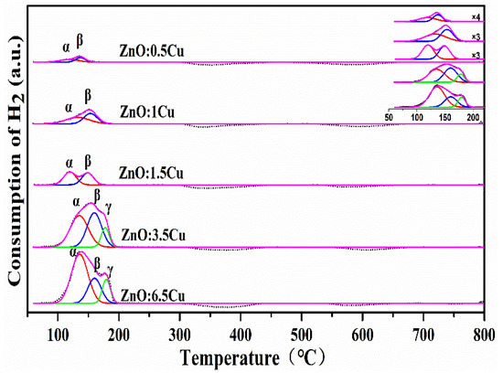 The hydrogen temperature-programmed reduction (H2-TPR) profiles of various Cu doped ZnO were presented in Figure 5 in order to determine the reduction process of Cu species. Three reduction peaks can be deconvoluted, the reduction temperature range of 130–145 °C, 150–160 °C and 170–180 °C, corresponded to α, β and γ peak, respectively. The α peak was ascribed to the reduction of Cu2+ → Cu+ and further reduction to Cu0 [36,50]. In addition, this behavior suggests a certain interaction between the incorporated Cu and ZnO support [51]. The β peak was attributed to the reduction of Cu+ to Cu0 due to the unreacted Cu+ from the two-step reduction process of dopant Cu2+ [36]. Compared to the lower doping samples, ZnO:3.5Cu and ZnO:6.5Cu both have a unique H2 consumption peak, γ, in the temperature region of 170–180 °C, which should be assigned as the reduction of Cu2O according to XRD results. These results indicate that all Cu species can be reduced to Cu0 to form the direct contact Cu-ZnO interface.