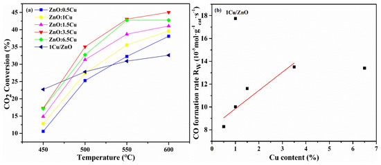 The catalytic performance of 1Cu/ZnO and ZnO:XCu samples was evaluated. For all samples, higher CO2 conversion can be obtained at higher reaction temperature as shown in Figure 7a. The doping of Cu can significantly improve the catalytic activity and the ZnO:3.5Cu sample exhibited the highest CO2 conversion for RWGS reaction. With a further increase in the amount of Cu, the activity of ZnO:6.5Cu was suppressed and even lower than that of ZnO:3.5Cu at 550 °C. This indicates that there exists an optimum copper doping amount and a further increase in the amount of Cu would decrease the catalytic activity. Furthermore, in order to further understand the reactivity of direct contact Cu-ZnO interface on RWGS reaction, the CO formation rate per catalyst weight (Rw) on the investigated catalysts as a function of Cu amount at 450 °C were illustrated in Figure 7b. As shown, when the amount of Cu less than 3.5 wt %, CO formation rate by catalyst weight increased along with the Cu doping amount and presented almost linear correlation. This implies that higher Cu doping is beneficial to RWGS reaction. Compared with all ZnO:XCu catalysts, it is clear that 1Cu/ZnO exhibits the superior catalytic reactivity at 450 °C; however, when the reaction temperature higher than 500 °C, it is significantly lower than that of ZnO:XCu model catalysts.