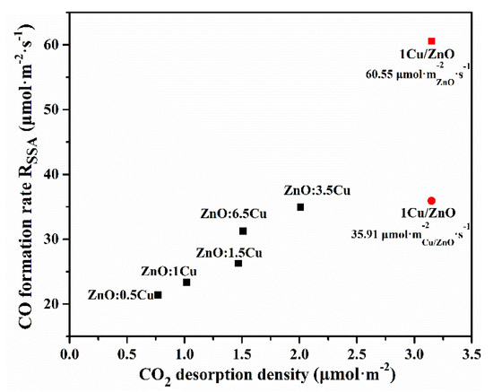 The surface basic sites are pivotal to the RWGS reaction. According to the previous publications, the introduction of transition metal dopants (Cu2+, Ni2+, Fe2+ etc.) will change the basicity of the host metal oxides, then modifying the adsorption capacity and strength of acidic CO2 [56,57,58]. Here, the desorption from medium basic sites increase along with the increase of Cu doping; however, when the amount of Cu reached 6.5 wt %, it was only close to that of ZnO:1.5Cu according to CO2-TPD. Then, the relationship between RSSA and CO2 desorption density (based on the surface area) from the medium basic sites was displayed in Figure 8 and the corresponding specific surface area of all samples was listed in Table S2. Figure 8 clearly demonstrates that the higher density of the moderately adsorbed carbon species leads to higher RSSA and plays important roles in CO formation. Interestingly, ZnO:6.5Cu has higher RSSA than that of ZnO:1.5Cu but with similar amount of carbon species desorption from the medium basic sites. EPR results indicate that doped Cu2+ mainly replace lattice Zn2+ sites and interstitial sites (Zni), while SEM and XRD characterization demonstrate the appearance of some Cu NPs on the surface of plate ZnO over ZnO:6.5Cu sample. Besides, it is widely accepted that the ZnOx will migrate from bulk ZnO support to the surface of Cu NPs to form ZnOx-Cu-ZnO interface during reduction in H2 [12,22], which should account for the peculiar CO2 adsorption behavior of ZnO:6.5Cu sample. Therefore, the higher RWGS reactivity of ZnO:6.5Cu compared to ZnO:1.5Cu should be due to the formation of ZnOx-Cu NP-ZnO interface on ZnO:6.5Cu. This means ZnOx-Cu NP-ZnO interface also displays apparent RWGS reactivity.