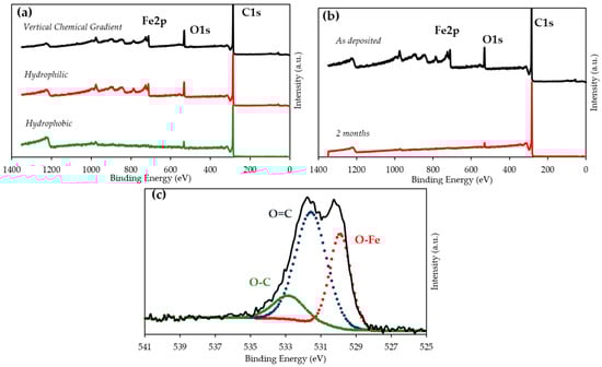 The XPS analysis was reinforced by studying the near-surface oxygen-to-carbon ration [O]/[C] (Figure 5): the [O]/[C] only decreased 30% over two months for the VCG sample, whereas it dropped by 51% and 86% for hydrophobic and hydrophilic samples, respectively. Upon the closer investigation of the Fe content in the films, we noticed similar behavior to that of O. Fe peaks appeared at 710.9 and 726 eV, corresponding to Fe2p3/2 and Fe2p1/2, respectively [52]. Furthermore, the couplings of the Fe peaks situated from 710.8–711 eV and O1s peaks at 529.8 were indicative of the formation of Fe oxides such as α-Fe2O3 or γ-Fe2O3 [53,54]. Similarly, Fe peaks at binding energy of 711.5 eV coupled with two distinct O peaks at 529.9 and 531.6 eV were associated with the formation of FeOOH [53,54]. Overall, Fe seemed to be present under its different oxidation states in the films.