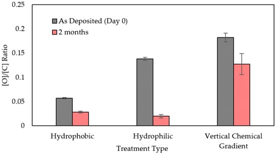 In the hydrophobic reference case, very little O was incorporated into the polymer film, as expected, and a 49.3% decrease was measured after two months. For hydrophilic samples, this value was 79.7%, thus indicating the reversion from a hydrophilic, wettable surface back to a hydrophobic surface. In the case of the VCG samples, O contained near the surface of the film decreased by 25.4%, displaying an increased retention of O resulting in a higher stability in the hydrophilic PICVD treatment and a delayed or decelerated hydrophobic recovery.