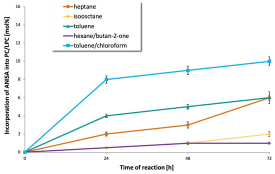 Reaction media play an important role in maintaining enzyme catalytic activity and stability. It also influences the relative solubility of the substrates, which is a crucial point in the case of enzymatic reactions with phenolic acids and their derivatives. In order to investigate the most suitable organic media for the acidolysis of PC with ANISA and VERA, three different solvents with logP ranging from 2.5 to 4.5, mostly used in the enzymatic lipophilization of phenolic acids, were examined [26,37]. The results showed that acidolysis carried out in toluene (logP = 2.5) and heptane (logP = 4) gave the incorporation of ANISA into the PLs fraction at the level around 6 mol % in both organic solvents. Lower incorporation of ANISA, only 2 mol %, was obtained for the reaction performed in isooctane (logP = 4.5). The obtained results were somewhat inconsistent, with general reports indicating that solvents with logP values > 3 are more suitable for enzymatic modifications of lipids [38] because hydrophobic solvents have lower capability to remove water from the enzyme, thus providing higher enzyme activity. However, it is worth noting that not the logP alone, but the cumulative effect of various other factors such as the solubility of the substrate, determines the enzyme activity in the organic solvent system. To overcome the limited solubility of the hydrophilic ANISA in the hydrophobic organic solvents, previously studied as effective media for the synthesis of phenoylated lipids, binary organic solvent mixtures of hexane/butan-2-one (85:15 v/v) [39] and toluene/chloroform (9:1, v/v) [26] were used. The results presented in Figure 2 show that the change of the reaction medium from toluene to a mixture of toluene with chloroform in the proportion 9:1 v/v resulted in higher ANISA incorporation from 6 to 10 mol % after 72 h. The second binary solvent system hexane/butan-2-one was reported not to be an appropriate reaction medium for the synthesis of phenolic lipids, leading to lower incorporation at the level of 1 mol %. The low enzymatic activities in the more polar solvent mixtures may be due to the poor solvation of PC in this reaction medium, which could hinder the interaction between Novozym 435 and ANISA. On the basis of the findings, the toluene/chloroform (9:1 v/v) mixture was used as a reaction medium throughout this study. At this stage of the study all five reaction media were also evaluated for the synthesis of PC enriched with VERA, but no significant results were obtained (incorporation less than 1 mol %, data not shown in Figure 2).