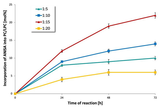 In order to maximize the enzymatic synthesis of O-methylated phenophospholipids, the effect of substrate molar ratio on the time course of the acidolysis reaction was investigated by varying PC to anisic and veratric acids from 1:5 to 1:20 and using a toluene and chloroform mixture (9:1 v/v) as the reaction medium. Reactions were carried out at 50 °C and Novozyme 435 was used at a dose of 30% (w/w). Figure 3 only illustrates the profile of incorporation of ANISA into the PL fraction because despite the use of increasing concentrations of veratric acid in the reaction medium, we did not observe an increase in its incorporation into PC. In the case of anisic acid, the results demonstrate that its incorporation increases with increasing molar ratios of ANISA to PC. The highest incorporation (22 mol %) occurred at a 1:15 substrate molar ratio of PC to ANISA. This value was significantly higher than that reported at the 1:10 and 1:5 substrate molar ratios. Previous studies have shown that a higher acid to PC molar ratio directs the reaction equilibrium toward the synthesis of the product [26,27] and our results support this observation. However, here, no further increase in the incorporation of ANISA was observed when the substrate molar ratio was beyond 1:15. At the substrate molar ratio 1:20, we observed that incorporation of ANISA into the phospholipid fraction drastically decreased. This phenomenon may be explained by the inhibition effect of high concentration of the substrate in the reaction medium on the enzyme activity. As highlighted above, solubility limitation of the substrate may also be a key factor. The increase in substrate amounts higher than the solubility limitation may not increase the concentration of substrate available for reaction, instead increasing viscosity and decreasing mass transfer, which might result in a decrease of incorporation.