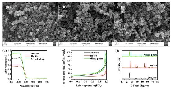 SEM images, UV-Vis graphs, and XRD patterns of anatase, mixed phase, and rutile forms of TiO2 nanoparticles. (a–c) SEM images, (d) UV-Vis DRS, (e) N2 adsorption-desorption isotherms, and (f) XRD patterns.