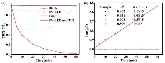 (a) CBZ degradation control experiments (b) The pseudo-first-order kinetic models of CBZ degradation. C(CBZ)0 = 18.8 µM; operating temperature = 20 °C; wavelength of UV-LED = 365 nm; I0 = 774 µW/cm2; and operating pH = 7.6.