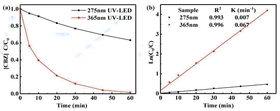 (2) Photocatalytic degradation of CBZ under LED wavelength of 365 nm was more effective than 275 nm, which could be due to the stronger permeability of 365 nm light in solution.