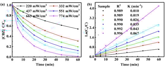 The radiation intensity of UV-LED is one of the important factors affecting the photocatalytic reaction, and it directly determines the number of photo-generated electrons and holes in the photocatalytic system. The effects of UV radiations of different intensities (220, 332, 437, 551, 663, and 774 μW/cm2) on the degradation rate of CBZ at a fixed wavelength of 365 nm, were studied. Obviously, as shown in Figure 4a, the degradation rate increased with increase in light intensity. In particular, CBZ could be completely degraded at an irradiation intensity of 774 μW/cm2 within 60 min. However, the degradation rate of CBZ at a light intensity of 220 μW/cm2 within 60 min was only 57.23%. When the light intensity was changed from 220 μW/cm2 to 774 μW/cm2, the reaction rate constant for photocatalytic degradation showed a 6.7-fold increase (Figure 4b).