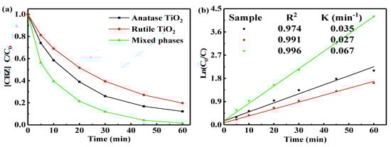 (a) Degradation of CBZ by UV-LED/TiO2 using different crystal forms of nano-TiO2 photocatalyst. (b) The pseudo-first-order kinetic models of CBZ degradation by UV-LED/TiO2 using different crystal forms of nano-TiO2 photocatalyst. C(CBZ)0 = 18.8 µM; operating temperature = 20 °C; wavelength of UV-LED = 365 nm; operating pH = 7.6; and C (mixed-phase TiO2) = 2.0 g/L.
