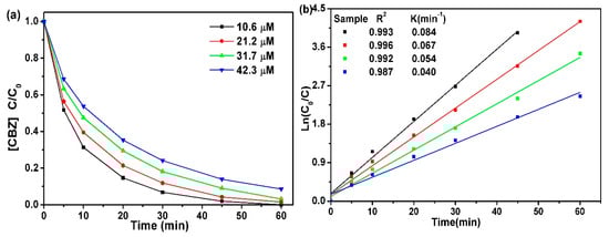 CBZ solutions of four different concentrations (10.6, 21.2, 31.7, and 42.3 µM) were used to evaluate the effect of initial concentration of CBZ on degradation. As shown in Figure 6, when the CBZ concentration in the original aqueous solution increased from 10.6 to 42.3 µM, the degradation rate decreased slightly. However, the rate constant decreased sharply from 0.084 to 0.040 min−1. The reason for this phenomenon was that when the initial CBZ concentration was high, a higher number of CBZ molecules competed for the photogenerated holes and hydroxyl radicals in the system. The reduction in the main active material for photocatalytic reaction reduced the degradation rate of CBZ.