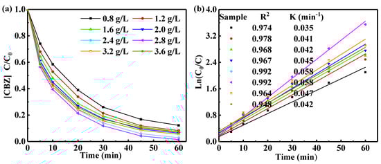 The effect of amount of photocatalyst on CBZ degradation was investigated by changing the mass concentration of initial TiO2 (mixed crystal form) in the range of 0.8–3.6 g/L. Figure 7 shows the degradation curves of CBZ with different dosages of TiO2. When the amount of TiO2 was 0.8 g/L, the degradation rate reached 87.78% within 60 min. The degradation rate gradually reached its maximum value (98.5%) when 2.8 g/L of TiO2 was used (Figure 7a). Further, as the TiO2 dosage was further increased from 2.8 to 3.6 g/L, the degradation efficiency decreased. High concentration of catalyst increases light scattering and reduces light penetration, which decreases the utilization of light. These factors were responsible for the decrease in degradation activity. CBZ underwent fastest degradation, with a rate constant of 0.058 min−1, when the TiO2 mass concentration was 2.4 g/L (Figure 7b).