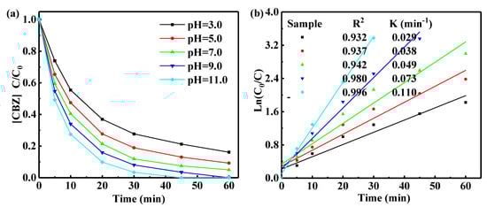 During the entire process of photocatalytic oxidation, the pH of reaction system also greatly influences the degradation efficiency of the target compounds, which in turn is mainly affected by the generation of hydroxyl radicals [30]. Figure 8 shows the degradation of CBZ under different pH conditions (3.0, 5.0, 7.0, 9.0, and 11.0). As the pH increased from 3.0 to 11.0, the degradation rate increased gradually. The reaction rate was the fastest when the pH was 11 and its rate constant reached 0.110 min−1, which was about 4 times than that at pH = 3.0. The ·OH species was mainly formed from OH−, and the production efficiency of OH− was much higher than that of H2O to produce ∙OH. Therefore, an aqueous alkaline environment was more conducive for the degradation of CBZ.