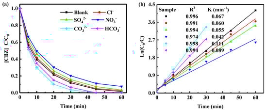 Coexistence of different anions and cations in water has different effects on the photocatalytic degradation of CBZ [31]. The concentration of a fixed coexisting anion and cation in the CBZ degradation reaction system was 1 mmol/L, keeping other conditions unchanged (C(mixed-phase TiO2) = 2.0 g/L; C(CBZ)0 = 18.8 µM; operating temperature = 20 °C; wavelength of UV-LED = 365 nm; I0 = 774 µW/cm2; and operating pH = 7.6). The effects of common anions and cations in water on the degradation of CBZ were investigated. As shown in Figure 9, the presence of Cl− in the system had little effect on the photodegradation process of CBZ, whereas NO3− had a slight inhibitory effect. The SO42− promoted the degradation to certain extent, while the presence of CO32− and HCO3− significantly promoted the photocatalytic degradation of CBZ. When a large number of CO32− and HCO3− coexisted in the solution, the solution was alkaline. An increase in the number of OH− ions was useful for the formation of ·OH, which improved the photocatalytic activity of the system. Hu et al. [32] reported that CO32− and HCO3− promoted the photocatalytic degradation of sulfamethoxazole, which was consistent with the results of this study.