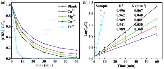 (a) Degradation of CBZ by UV-LED/TiO2 with different co-existing cations. (b) The pseudo-first-order kinetic models of CBZ degradation by UV-LED/TiO2 with different co-existing cations.