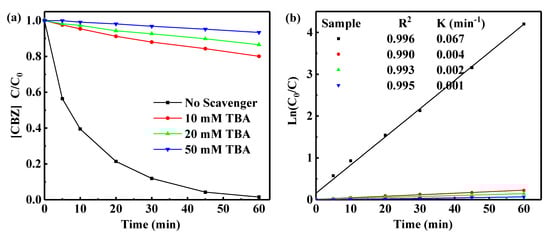 The ·OH radical is considered to be the main active species in TiO2 photocatalytic degradation reaction [33]. By adding different concentrations of t-butanol (TBA) as the OH scavenger to the reaction system, the effect of number of active ·OH radicals on the photocatalytic degradation was studied. As shown in Figure 11, the presence of TBA significantly inhibited the photocatalytic degradation of CBZ. With increase in TBA concentration in the reaction system, the inhibitory effect was enhanced. When the TBA concentration in the system was 10 mM, the degradation efficiency was 19.91% after 60 min of UV-LED irradiation. As the TBA concentration increased to 50 mM, the degradation efficiency was only 6.58%. These experiments also show that OH species are indeed the main active species in CBZ degradation.
