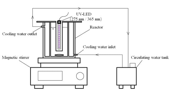 The photocatalytic degradations were performed in a 500 mL open plexiglass container. In order to prevent light energy, UV-LED light, and heat energy, a layer of aluminum foil was tightly wrapped around the outer wall of the reactor. The UV-LED tube was placed in a cylindrical radiation window having a diameter of about 5 cm, which was made of quartz. The light source was composed of two self-made UV-LED units, and the working wavelengths of the two units were 275 and 365 nm. Each unit contained 40 LED chips (manufactured by Shenzhen Julan Technology Co. Ltd., China). The output of 275 nm was about 2.8 mW with a current of 40 mA and the output of 365 nm was about 700 mW with a current of 500 mA. The fluence rate was measured in all experiments using a potassium ferrioxalate actinometer [34]. A low-temperature constant temperature circulating water tank was used to circulate cooling water on the outer wall of the reactor in order to control the temperature during the operation at 20 ± 0.5 °C. The intensity of the radiations irradiated into the reactor was measured using an IL-2400 irradiation photometer (International Light, USA). The diagram of UV-LED/TiO2 photocatalytic device used in this study is shown in Figure 12.