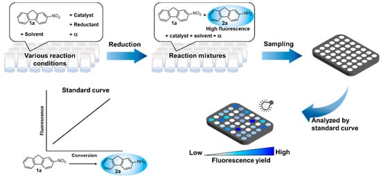 In order to develop a new synthetic method, numerous reaction parameters, including catalysts, temperature, reagents, and solvent, should be screened to optimize the reaction conditions. This screening consumes significant human and material resources and slows down the development of a new method. To overcome this issue, several high-throughput screening (HTS) methods have been designed to enhance the efficiency of the development process, facilitating the analysis required to develop an efficient approach. In general, automated analysis instruments such as high-performance liquid chromatography (HPLC) [22,23], gas chromatography (GC) [24,25,26], mass spectrometry (MS) [27,28,29], and nuclear magnetic resonance (NMR) [30,31] have been used in HTS methods. Although these approaches provide accurate results, they require long analysis times per sample; another issue is represented by the cost of the automated instruments. To address these problems, colorimetric [32,33,34,35] or fluorescent [36,37,38,39,40,41,42] HTS methods have been developed; these approaches require short analysis times and relatively inexpensive instruments. Based on these advantages, our group previously developed several HTS methods for chemical reactions, using an optical chemosensor system to evaluate the efficiency of reaction parameters including catalysts, additives, solvents, and substrates [43,44,45,46,47,48,49,50]. The efficiency of the reaction conditions was rapidly analyzed based on optical changes in the chemosensor. We thought that this strategy could be applied to accelerate the development of new methods for the reduction of nitroarene compounds.