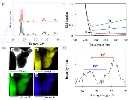 X-ray diffraction (XRD) patterns [I] of tungsten trioxide (WO3) (a) and Pt(0.4)-WO3 (platinum-tungsten trioxide) (b); ultraviolet–visible (UV–Vis) absorption spectra [II] of WO3 (c), Pt(0.1)-WO3 (d), Pt(0.2)-WO3 (e), Pt(0.4)-WO3 (f); scanning transmittance electron microscope (STEM) image (g) and energy-dispersed X-ray emission spectroscopy (EDS) (h–j) [III] of the Pt(0.4)-WO3: O (h), W (i) and Pt (j); and XPS [IV] of Pt (4f) of the Pt(0.4)-WO3.
