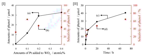 In a recent study, one-step direct hydroxylation of benzene toward phenol has been extensively studied using homogeneous photocatalysts such as quinolinium ions and [RuII(Me2phen)3]2+ ions, [18,19,20,21], and heterogeneous semiconductor photocatalyst such as TiO2 [22,23,24,25,26,27] and WO3 [28,29] have been employed for selective photocatalytic hydroxylation of benzene to phenol under photo-irradiation ultraviolet (UV) light and/or visible-light. Yoshida et al. previously reported that platinum (Pt)-loaded TiO2 (Pt-TiO2) photocatalyst exhibited direct hydroxylation of benzene to form phenol and H2 in the absence of O2 under UV-light irradiation [22]. Also, Tomita et al. reported that the Pt-deposited WO3 (Pt-WO3) photocatalyst exhibited selective hydroxylation of benzene to phenol in the presence of O2 and H2O under light irradiation of both UV light and visible light (300 < λ < 500 nm) [28,29]. It was also confirmed that OH derived from H2O is included in phenol by employing an H218O labeling experiment [29]. However, in a previous study, photocatalytic activities and reaction mechanisms for hydroxylation of benzene on the Pt-WO3 have not been demonstrated under only irradiation of visible-light (λ > 420 nm).