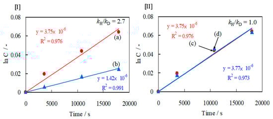 Kinetic isotope effects (KIE) on photocatalytic hydroxylation of benzene in the presence of air and H2O on Pt(0.2)-WO3 (20 mg) under visible light irradiation. Hydroxylation of C6H6 in the presence of H2O (a) and D2O (b) [I]; and that of C6H6 (c) and C6D6 (d) in the presence of H2O [II].