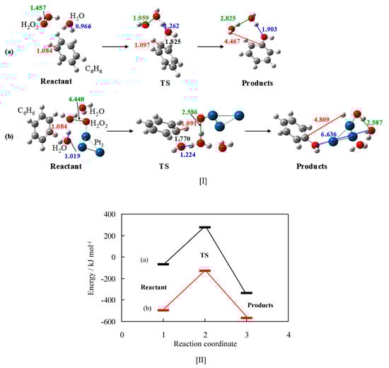 Optimized structures at the reactant, TS and product between benzene, H2O and H2O2 system in the absence [Ia] and presence [Ib] of Pt3 as co-catalyst for the hydroxylation of benzene to form phenol; and energy potentials for intrinsic reaction coordinates (IRC) [II]. The stabilization energy at each state was calculated by the difference from the energy of isolated system. The bond distance (Å) of O–H in H2O (blue), O–O in H2O2 (green) and C–H in benzene (red) were indicated.