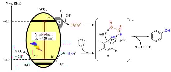The reaction mechanism for the direct hydroxylation of benzene to phenol on the Pt-WO3 was proposed (See Figure 6). This reaction is initiated by visible-light irradiation of the WO3. The photo-induced holes and electrons are generated in the VB and CB of the WO3, respectively. It was assumed that the photo-induced holes can oxidize H2O to form O2 [1], as well as activated (H2O)* intermediate species of which the O–H bond length would be increased. On the other hand, the electrons effectively transfer from CB to O2 via Pt species to form peroxide species such as H2O2, which would be further activated on the catalyst surface. The activated (H2O)* species would attack the π electrons of the aromatic benzene ring, assisting the activated (H2O2)* to dissociate the C–H bond in benzene. It was, thus, proposed that the hydroxylation of benzene occurs by a mechanism involving a push-pull process, which promotes the formation of phenol.