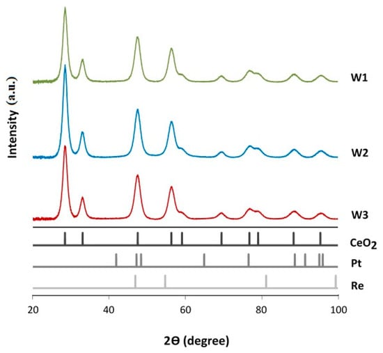 The ED-XRF results stated an effective metal loading of 0.88 wt%–0.90 wt% for the three powder catalysts and confirmed the expected Pt/Re ratio (Table 1). The specific surface area measurements calculated with the Brunauer–Emmett–Teller (B.E.T.) method showed a small decrease in the surface area compared to that of the alone ceria (Table 1).