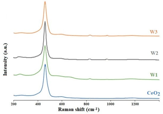Raman spectra of ceria and powder catalysts: W1, W2 and W3.