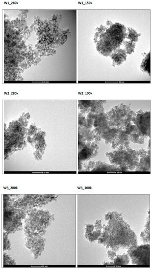 Transmission electron microscopy (TEM) images of powder catalysts: W1, W2 and W3.