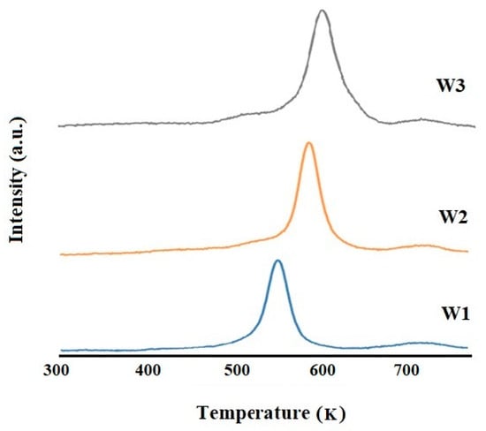 Specifically, the TPR profile of W1 catalyst showed a perfect overlapping, with the peak centered at 550 K, while in the case of W2 and W3 TPR profiles, the main peak shifted respectively to 593 K and 608 K, and a shoulder on the left appeared in both the curves, centered between 505 k and 510 K.