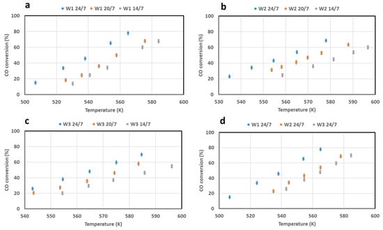 Figure 5a–c shows the catalytic activity of the three investigated catalysts towards the WGS reaction between 500 and 600 K as a function of the steam to carbon monoxide ratio. In Figure 5d the results obtained at the same H2O/CO ratio (24/7) are compared.