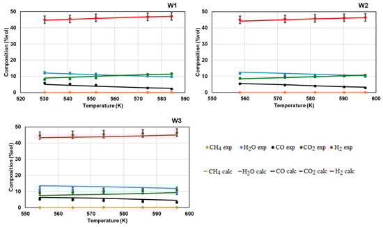 The experimental results obtained over the three Pt/Re catalysts and the analysis of product distribution as a function of reaction temperature, particularly regarding the methane formation, suggested that the reaction pathway over the three Pt/Re catalysts involved water–gas shift reactions and both CO as well as CO2 methanation. The pre-exponential factors and the apparent activation energies estimated for the three above reactions from the Arrhenius plots over the W1, W2 and W3 sample are shown in Table 2. The kinetic model results were validated by comparing them with the experimental results. In Figure 6, as an example, the comparison related to three catalytic systems in the condition of H2O/CO = 14/7 is reported. The data showed a good agreement between the kinetic model and the experimental results; in particular, it is possible to highlight that the kinetic model was able to predict the behavior of the catalytic systems in the investigated temperature range and, more importantly, it was able—fixing the active species ratio—to take into account the variation of the different feeding conditions investigated in this work (H2O/CO ratio in the range 2–3.84). The activation energy calculated for the W2 and W3 catalysts, with Pt/Re ratio of 1/1 and 1/2 respectively, were very close, both for WGS reaction and CO and CO2 methanation.