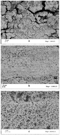 The hydrogen uptake measured during the TPR experiments was one order of magnitude higher than the theoretical one (Table 3), due to the spillover effect, however, the extension of this phenomenon was higher than in the case of the powder catalyst with the same Pt/Re ratio (Table 1). The H2-TPR profile of the structured catalyst was very different from the profile of the powder catalyst with the same Pt/Re ratio (Figure 7). The case of the powder catalyst’s two main peaks was present, however, the first peak was centered at a lower temperature, while the second peak showed a higher relative intensity, attributed to a much higher reducibility of the ceria surface, in agreement with the higher hydrogen measured uptake. These results suggested a different oxygen storage capacity of the ceria coating [39], attributable mainly to the preparation technique. In Figure 8, the scanning electron microscopy (SEM) images at different magnitude of the structured catalyst S1 are showed (a, c), with the intent to highlight the surface morphology. As is evident, the catalyst surface is extremely irregular, with the presence of numerous cavities and fractures, which justify the increase in surface area obtained due to the coating, and which are beneficial for the catalytic activity.