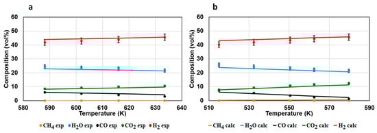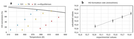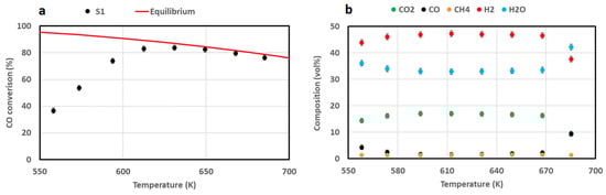The experimental hydrogen formation rate was also evaluated, highlighting once again a good agreement with the values predicted by the model (Figure 10b). The structured catalyst was also tested under a simulated reformate gas mixture coming from an ethanol pre-reformer followed by a methane reforming unit [40]. The catalyst activity was investigated in the temperature range 540–690 K and the results, showed in Figure 11, are presented in terms of CO conversion (a) and product gas distribution as a function of outlet reaction temperature (b). CO conversion linearly increased up to 610 K, showing a decreasing trend above 630 K; due to the negative effect of high temperatures on WGS thermodynamics. Only slight variations in methane concentration with reaction temperature were observed, suggesting that carbon oxide methanation was not the dominant pathway under the investigated conditions. A hydrogen production rate of 18.7 mmol/min was recorded at 685 K and this value (properly scaled on the basis of the different feeding flow-rates) was compared with the results of the simulations performed. The hydrogen productivity recorded over the structured catalyst is only 14% lower than the value reported, and this difference is mainly ascribable to the employment of a membrane in the WGS reactor in the reference process scheme. These very promising results allow us to conclude that the S1 structured catalyst is a suitable sample for the realization of a single-stage WGS process.
