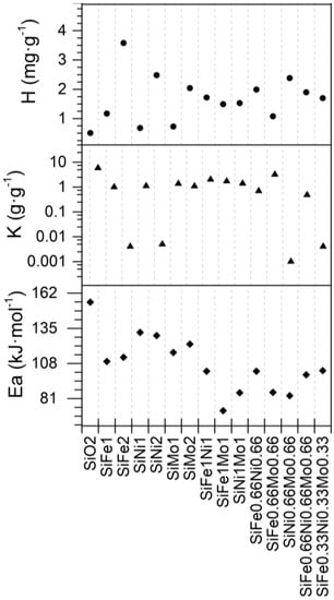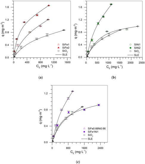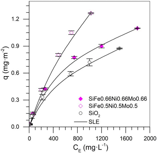 Figure 3 shows the asphaltene adsorption isotherms at 25 °C for the Si-Fe-Ni mixture design. In general, SiO2 showed less adsorption of the samples with the addition of TEOs. The transition elements increased the active sites, which generated an increase of asphaltene uptake and adsorption affinity []. When the content of asphaltenes increased in the solution, the adsorbed amount increased according to the adsorption isotherm.