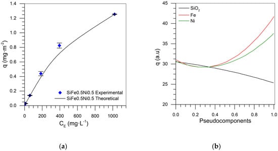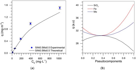 Figure 15a shows the predicted adsorption isotherm for nanoparticles composed of 0.33% mass fraction of each TEO. An RSM of 9.23% was obtained, based on the special cubic model. Once this mixture design is fully developed, the adsorption isotherms can be predicted for any system within the evaluated region. Figure 15b shows the trace plot for the tri-elemental mixture design, with the adsorbed amount as the response variable. This graph shows that the adsorbed amount increased as TEO content increased, and the contribution for maximizing this variable occurred in the order Mo < Ni < Fe.