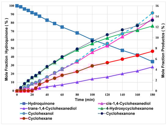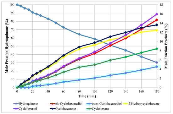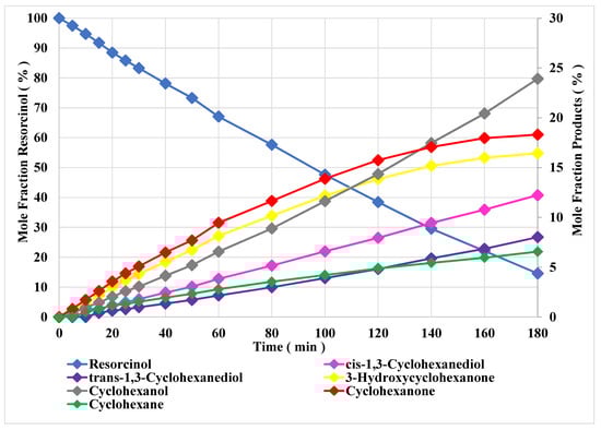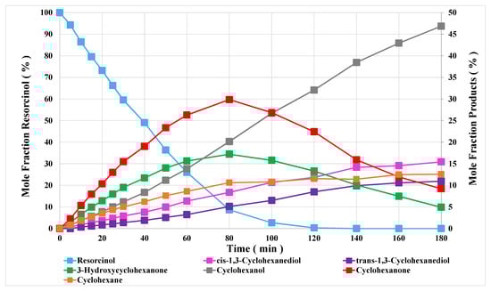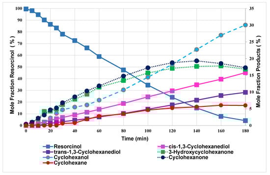 Figure 2, it is apparent that both cyclohexanone and 3-hydroxycyclohexanone were formed as intermediates, hydrogenating further to cyclohexanol and cyclohexanediol isomers, respectively. It can be seen that the two cyclohexanone intermediates initially had the highest selectivities, being formed directly from resorcinol. Their levels increased steadily over 80 min before decreasing as they were hydrogenated and not replaced from resorcinol.