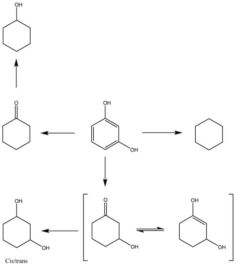 9]. It was found that resorcinol had the fastest rate of reaction, with the major products (cyclohexanol and cyclohexanone) formed through direct HDO of resorcinol (