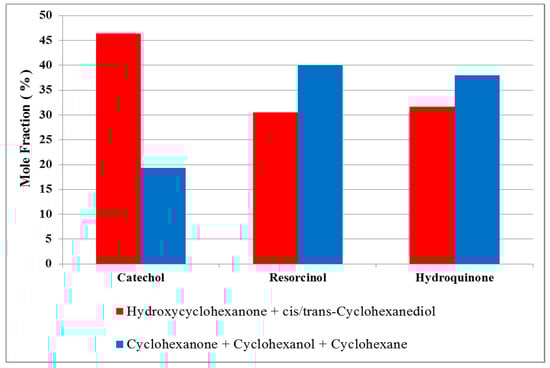 9]. However, their results do agree that catechol undergoes less hydrogenolysis than hydroquinone or resorcinol. Nevertheless, the higher activity for resorcinol in comparison to the other two isomers found in our study has been documented previously in a study by Maximov et al. [