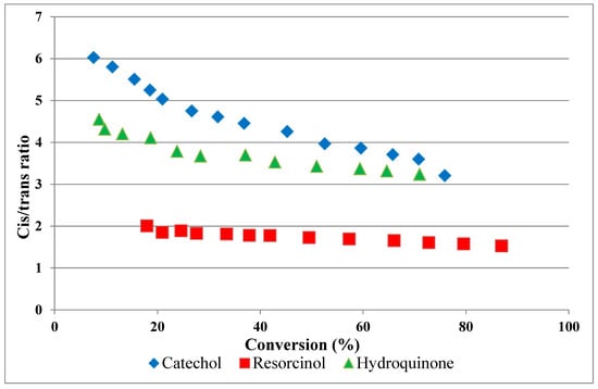 cis-isomer of ~33% compared to ~13% from resorcinol and hydroquinone. As mentioned previously, Song et al. [