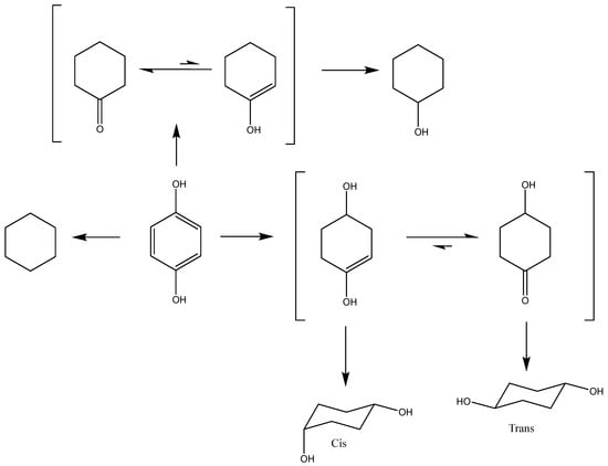 20]. The formation of cyclohexane from phenol, however, requires the cleavage of only one –OH group, whereas for dihydroxybenzene cleavage of two –OH groups is necessary. The different bond dissociation energies of aromatic and aliphatic C–O bonds, 468 and 385 kJ·mol
